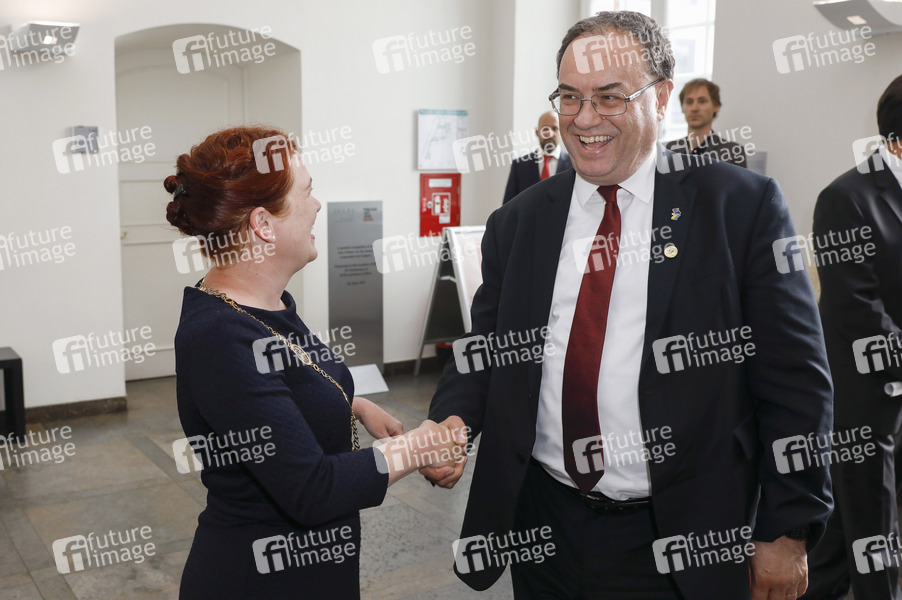 Katja Dörner und Andrew Bailey beim Bildtermin vom Eintrag einiger G7-Finanzminister und Notenbankgouverneure ins Goldene Buch der Stadt Bonn im Alten Rathaus. Bonn, 19.05.2022