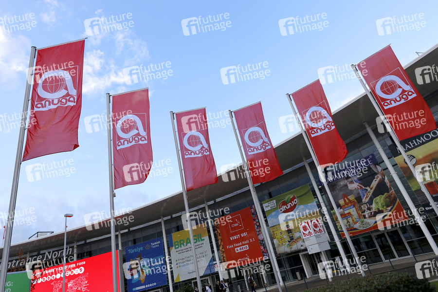 Fahnen, Logos, Anuga, Food, Ernährung, Essen, Trinken, Nahrung, Nahrungsmittel, Food-Messe, Lebensmittel-Messe, Lebensmittelmesse, FoodTech, Fachmesse, Innovationen, Nachhaltigkeit, pflanzliche Lebensmittel, Food-Trends, Laborfleisch, Flexitarismus, Tierwohl, neue Produkte, Anuga-Logo, Fahnen, Anuga-Fahnen, Symbolfoto, Symbolbild