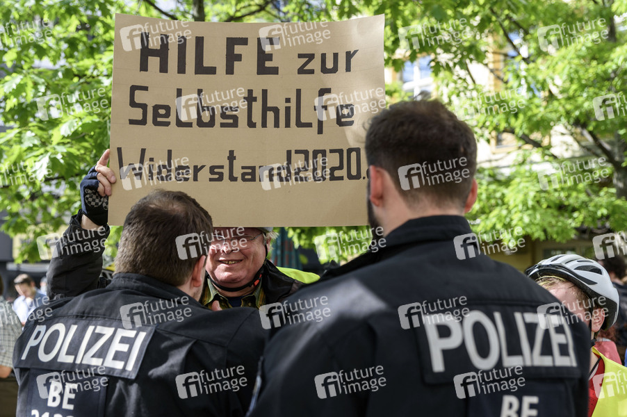 Protest der 'Kommunikationsstelle Demokratischer Widerstand Berlin' gegen die Einschränkung der Grundrechte durch die Corona-Eindämmungsverordnung im Rahmen Infektionsschutzes rund um die Berliner Volksbühne. Diese 7. Hygienedemo war mit mehreren Veranstaltungen angemeldet. An dem Protest beteiligten sich auch Verschwörungstheoretiker und Impfgegner, aber auch rechte Gruppierungen. Am Rande kam es zu einigen Festnahmen. Berlin, 09.05.2020