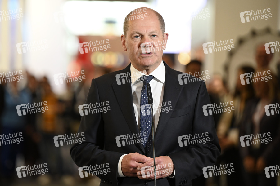 Olaf Scholz beim Pressestatement nach dem Eröffnungsrundgang auf der Hannover Messe 2022 auf dem Messegelände. Hannover, 30.05.2022