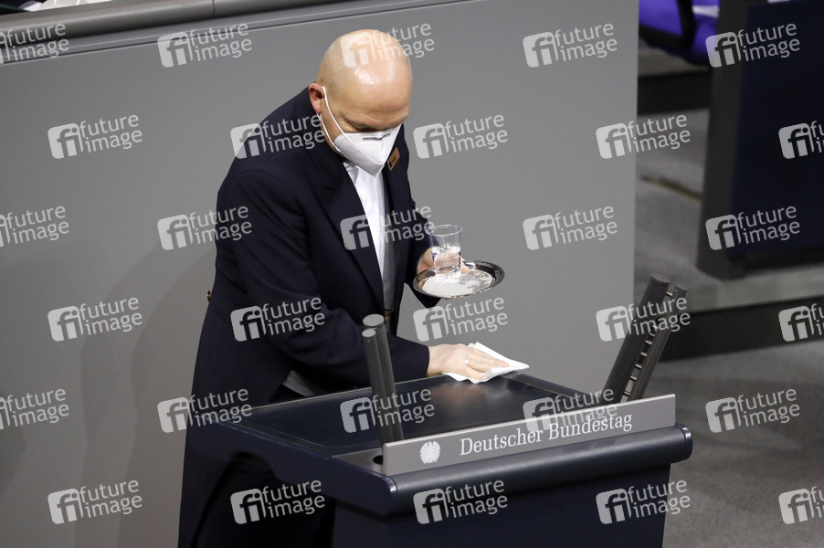 Saaldiener reinigt das Rednerpult wegen der Coronakrise in der 203. Sitzung des Deutschen Bundestages im Reichstagsgebäude. Berlin, 13.01.2021
