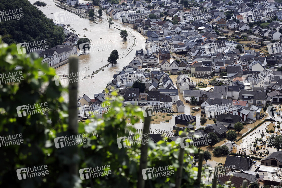 In der Eifel haben heftige Regenfälle und Dauerregen für Überschwemmungen und Überflutungen gesorgt. Im Ahrtal trat der Fluss vielerorts über die Ufer und überschwemmte nicht nur Keller sondern ganze Ortschaften. Im Bild der Ort Dernau, der beinahe komplett von den Wassermassen geflutet wurde. Viele Menschen verloren alles. Dernau, 15.07.2021