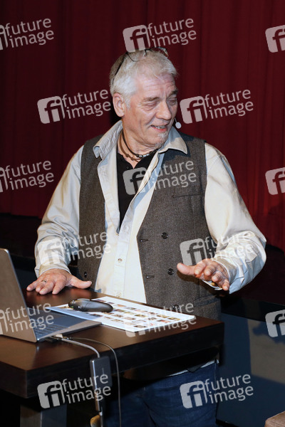 Jörg Düsterwald während seiner Vortragsreihe Art-Talk, bei der er begleitend mit einer Bildershow Erlebnisgeschichten aus seinem Künstlerleben erzählt, im Kino Phoenix Kurlichtspiele. Bad Nenndorf, 14.12.2025