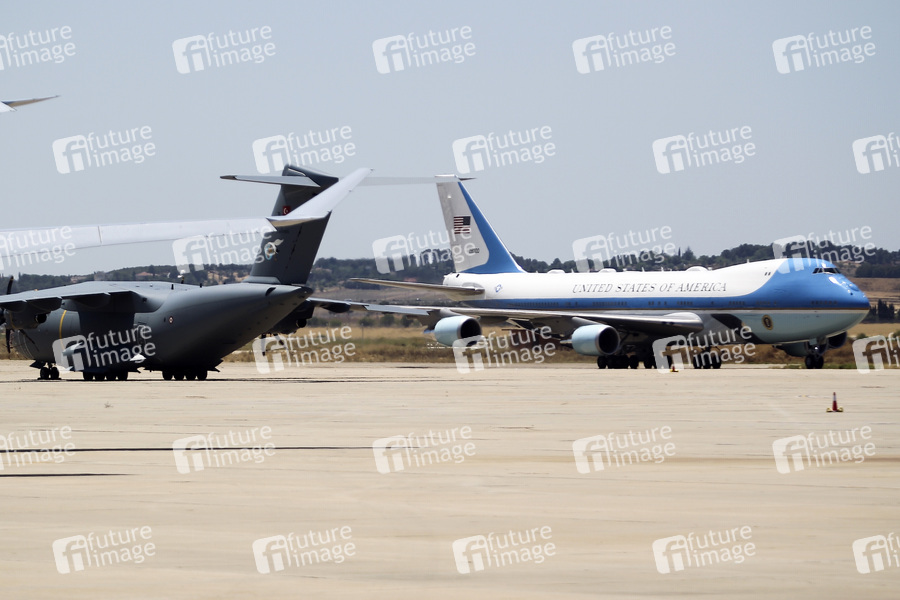 Ankunft, Glughafen, Airport, Militärflughafen, Base Aérea de Torrejón de Ardoz, Gipfeltreffen der NATO-Staaten, NATO-Gipel, Verteidigungsbündnis, Flugzeug, Boeing 747-200B, Präsident der Vereinigten Staaten, Demokratische Partei