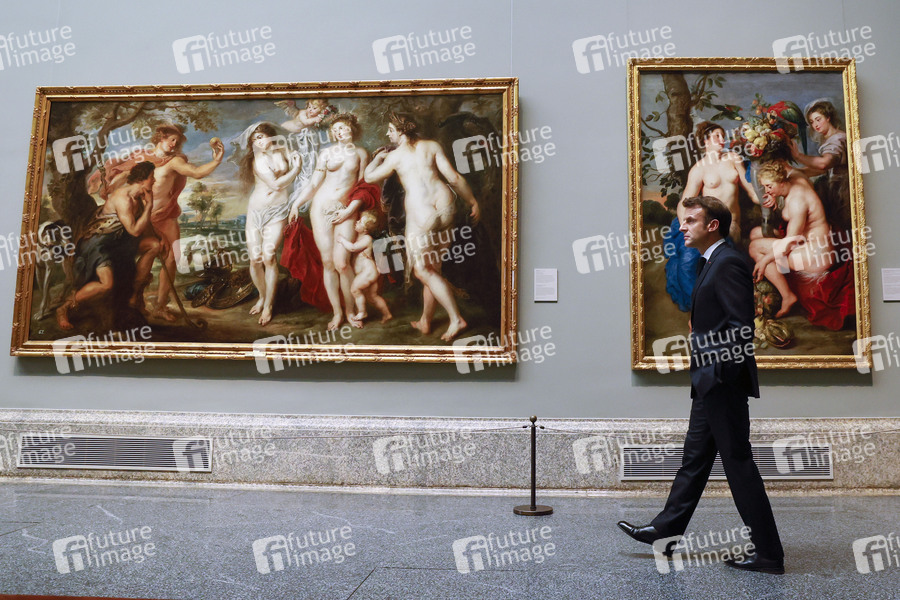 Emmauel Macron bei der Ankunft zu einem informellen transatlantischen Abendessen der NATO Staats- und Regierungschefs im Prado-Museum. Madrid, 29.06.2022
