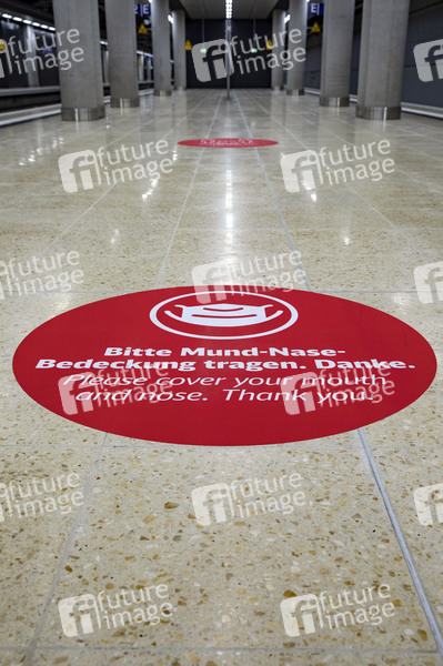 Bahnanschluss mit Hinweis auf Maskenpflicht am Bahnsteig am Flughafen Berlin Brandenburg (BER). Schönefeld; 01.11.2020