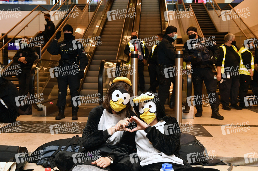 Klimaaktivisten der Aktionsgruppe 'Am Boden bleiben' protestieren gegen die Eröffnung des Flughafens Berlin-Brandenburg (BER). Schönefeld, 31.10.2020
