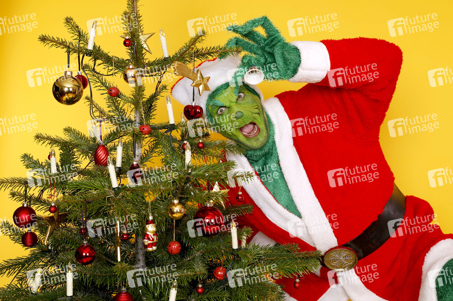 Aus dem FARBKÖRPER Kalender 2020 - Geek Art-Bodypainting und Transformaking: Christmas Photoshooting mit Enrico als Grinch im Fotostudio Schubert in Niedernwöhren. Ein Projekt des Fotografen Tschiponnique Skupin und des Bodypainters und Transformakers Enrico Lein