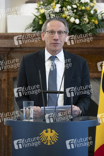 Jörg Kukies bei der Übergabe der Wohlfahrtsmarken 2025 durch den Bundesminister der Finanzen an den Bundespräsidenten im Schloss Bellevue. Berlin, 21.02.2025