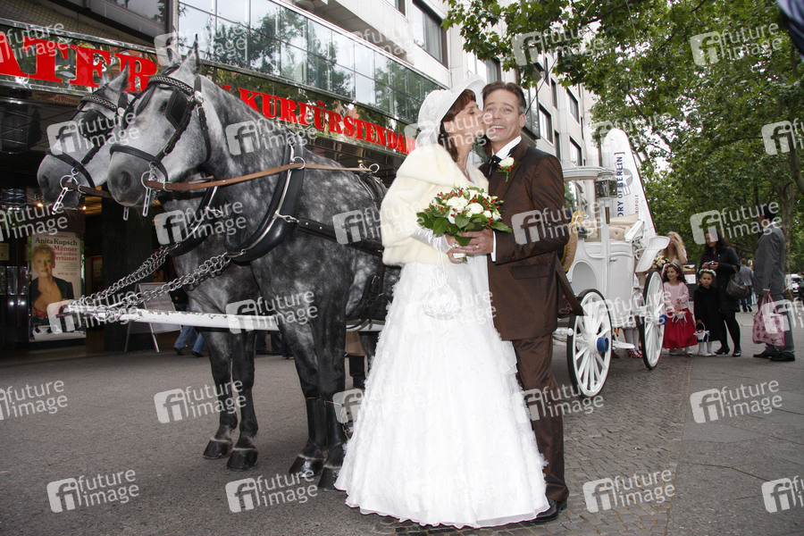 Das Brautpaar Jacques Breuer und Viola Wedekind mit der Hochzeitskutsche unterwegs vom Theater am Kurfürstendamm zur Hochzeitsfeier im Hotel Seehof