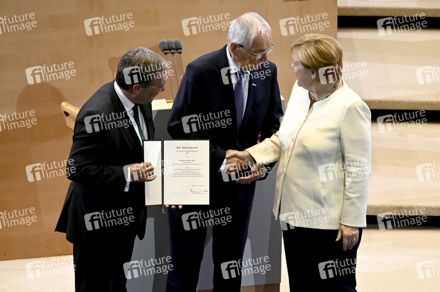 Armin Laschet, Klaus Töpfer und Angela Merkel bei der Verleihung des Staatspreises des Landes Nordrhein-Westfalen 2019 an Klaus Töpfer im WCCB. Bonn, 16.09.2019
