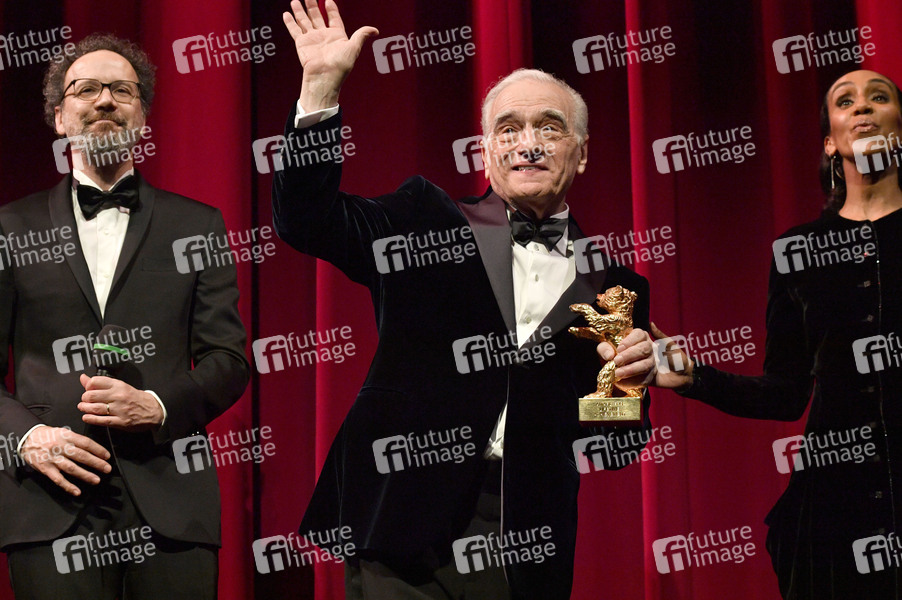 Carlo Chatrian, Martin Scorsese und Hadnet Tesfai bei der Verleihung des Goldenen Ehrenbären an Martin Scorsese auf der Berlinale 2024 / 74. Internationale Filmfestspiele Berlin im Berlinale Palast. Berlin, 20.02.2024