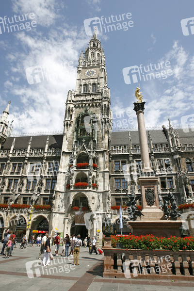 Marienplatz, Sitz des Oberbürgermeisters und der Stadtverwaltung, erbaut 1867 bis 1909 von Georg von Hauberrisser, Neugotik, der 85 m hohe Rathausturm mit dem Münchner Kindl an der Turmspitze enthält das fünftgrößte Glockenspiel Europas, 43 Glocken, 400 Zimmer
