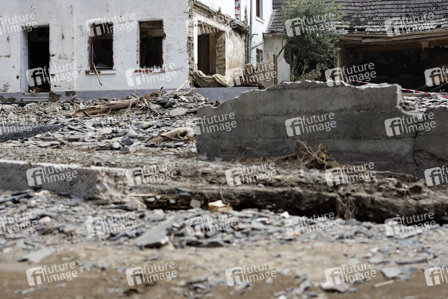 Nach dem Jahrhunderthochwasser in der Eifel durch heftige Regenfälle und Dauerregen mit Überschwemmungen und Überflutungen haben die Aufräumarbeiten im Ahrtal große Fortschritte gemacht. Einheiten von Polizei, THW, Bundeswehr und Feuerwehr mitsamt vielen freiwilligen Helfern haben Straßen geräumt, Schutt und Schlamm entfernt und die Menschen versorgt. Der Wiederaufbau wird trotzdem Jahre dauern. Im Bild Flutschäden bei der Ortschaft Mayschoß, in der die Flut viele Häuser zerstörte, 30.07.2021