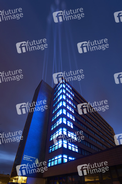 Lichtinstallation zum Weltwassertag (22.03.2021) am Gebäude der Stadtentwässerung. Bildfreigabe der Lichtinstallation durch Matthias Görn, Geschäftsleiter der Stadtentwässerung Hannover) und Felix Reinhold (allstars event Veranstaltungstechnik). Hannover, 21.03.2021