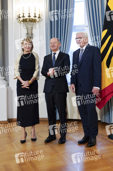 Elke Büdenbender, Olaf Scholz und Frank-Walter Steinmeier beim Neujahrsempfang des Bundespräsidenten im Schloss Bellevue. Berlin, 10.01.2025
