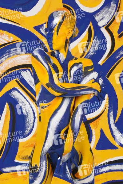 Bodyart: Blau-Gelb Splash Performance mit Model Anastasia im Atelier Düsterwald. Hameln, 22.08.2024 - BodyArt-Künstler: Jörg Düsterwald