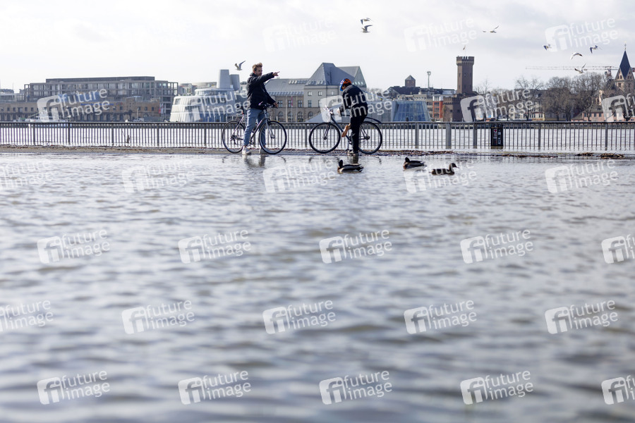 Die Pegelstände des Rheins in Nordrhein-Westfalen sind weiter gestiegen. Der Wasserstand in Köln lag nach Angaben des Hochwasserzentrums im Donnerstag bei 8,54 Metern. Schiffe müssen vor Anker gehen. Im Bild eine Impression vom Hochwasser am Rheinufer in Köln. Köln, 04.02.2021