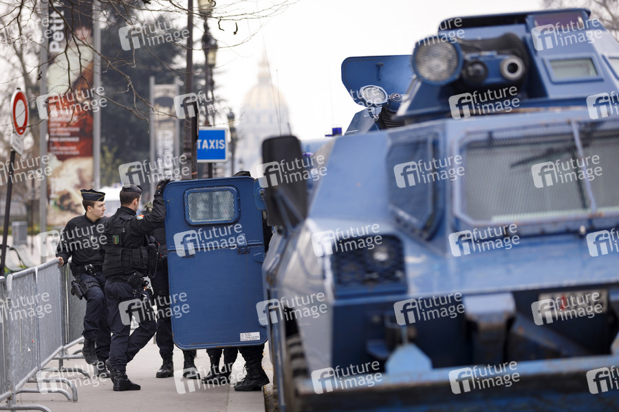 Sicherheitskräfte der französischen Gendarmerie bewachen wichtige Straßen und errichten Checkpoints rund um den Champ Elysees. Paris, 23.03.2019