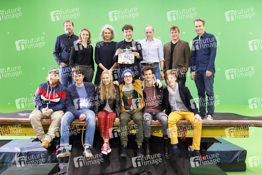 Axel Stein, Oskar Keymer, Eloi Christ, Lina Hüesker, Regisseur Granz Henman, Maximilian Ehrenreich und Georg Sulzer mit Produzenten und Autoren beim Fototermin am Set des Kinofilms 'Hilfe, ich hab meine Freunde geschrumpft' in den MMC-Studios in Ossendorf. Köln, 01.10.2019