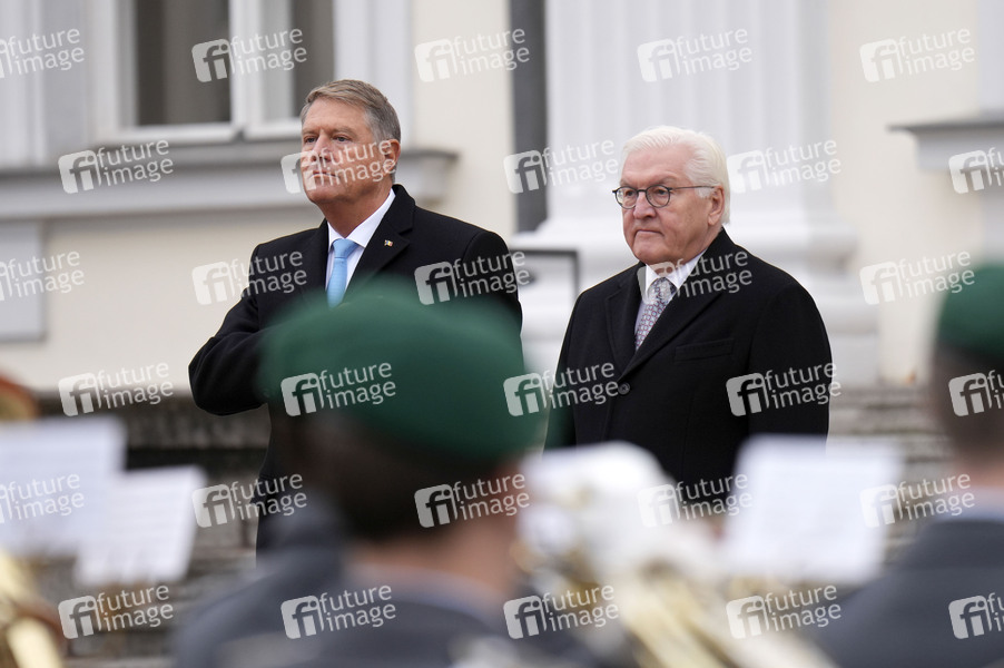 Klaus Iohannis und Frank-Walter Steinmeier beim Empfang des Präsidenten von Rumänien mit militärischen Ehren und zum gemeinsamen Gespräch im Schloss Bellevue. Berlin, 16.11.2024
