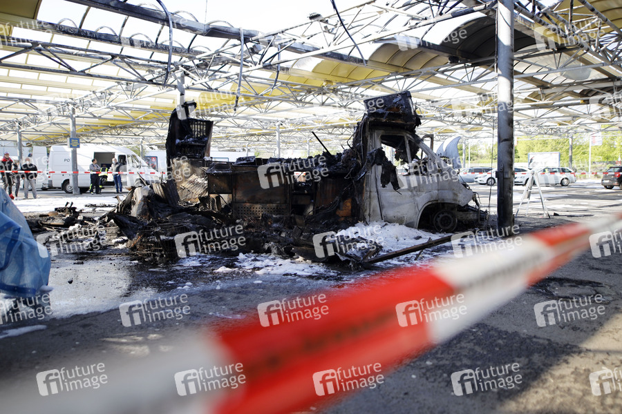 Willi Herrens Reibekuchen-Foodtruck ist auf dem Parkplatz des Großmarkts Selgros abgebrannt. Die Feuerwehr untersucht das Wrack. Warum der Foodtruck abgebrannt ist, muss noch ermittelt werden. Willi Herren war am 20. April tot in seiner Wohnung in Köln gefunden worden. Den Foodtruck hatte er erst wenige Tage vor seinem Tod eröffnet. Frechen, 03.05.2021