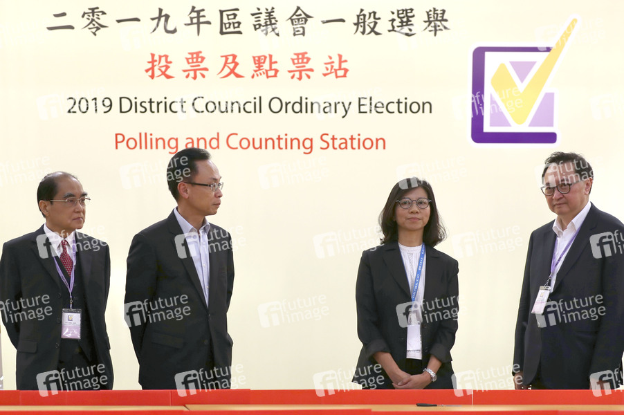 Der Vorsitzende der HKSAR-Wahlkommission (EAC), Barnabas Fung (ganz rechts), an der Auszählstation - Gewaltloses Wochenende in Hongkong. Fast 3 Millionen Hongkonger Bürger haben im Rahmen eines Referendums ihre Stimme abgegeben. Die Wahlbeteiligung wurde mit 71,2% von 4,1 Millionen Wahlberechtigten bestätigt. Es wird als Stimmungsbarometer zwischen dem Pro-Demokratie-Lager und dem Pro-Peking-Lager nach mehr als fünf Monaten des Aufruhrs in der Stadt angesehen. Das demokratische Lager in Hongkong hat bei den Bezirkswahlen einen klaren Sieg errungen. Hongkong, 24.11.2019