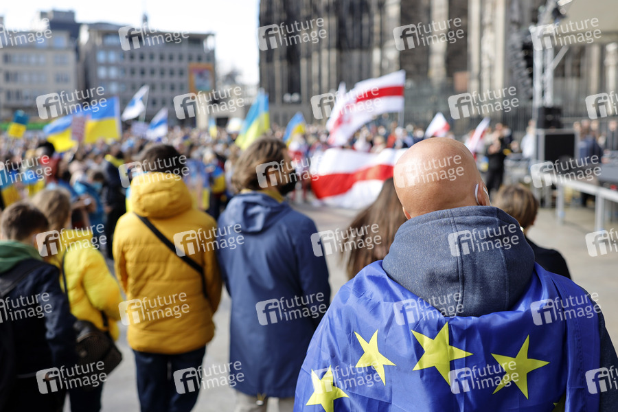 Demonstranten bei einer Demonstration gegen den Krieg in der Ukraine organisiert vom Verein 'Blau-Gelbes Kreuz' auf dem Roncalliplatz. Köln, 13.03.2022