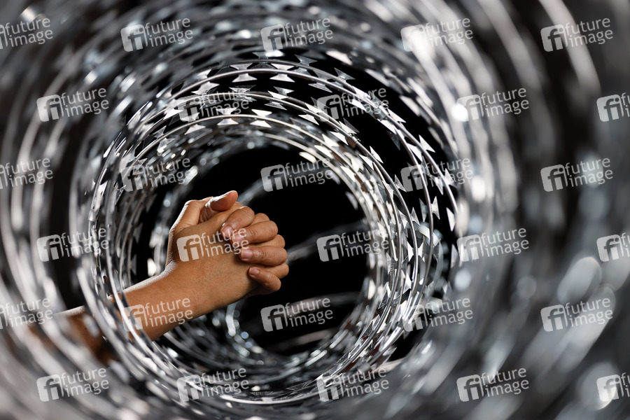 Eine Frau faltet die Hände in einem Stacheldrahtzaun. Millionen Flüchtlinge sind Opfer von moderner Sklaverei. Am 10. Dezember wird ihr Schicksal thematisiert beim Tag der Menschenrechte. (Themenbild, Symbolbild)