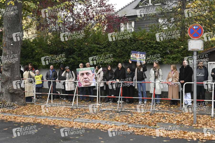 Demonstranten bei einer Protestaktion vor der Botschaft der Islamischen Republik Iran nach der Hinrichtung des Deutsch-Iraners Jamshid Sharmahd. Berlin, 29.10.2024