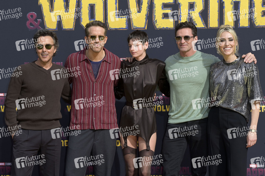 Shawn Levy, Ryan Reynolds, Emma Corrin, Hugh Jackman und Wendy Jacobson beim Fan-Screening des Kinofilms 'Deadpool & Wolverine' im UCI Luxe am Uber Platz. Berlin, 07.07.2024