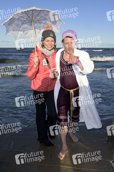 Jessica Ginkel und Hendrik Duryn beim Baltic Lights 2023 Charity-Hunderennen zu Gunsten der Welthungerhilfe zwischen der Seebrücke Ahlbeck und der Seebrücke Heringsdorf. Heringsdorf, 04.03.2023