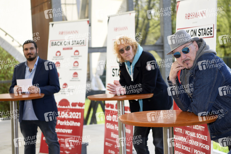 Nico Röger, Christof Stein-Schneider und Kai Wingenfelder beim 'Back on Stage'-Pressetermin von Hannover Concerts zur Vorstellung vom Konzertsommer 2021 mit Fury in the Slaughterhouse auf der Gilde Parkbühne. Hannover, 16.04.2021