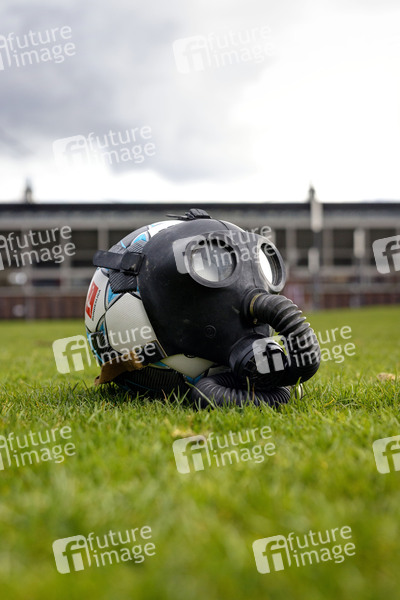 Ein Fußball mit Gasmaske vor dem Rheinenergie Stadion. Köln, 14.03.2020
