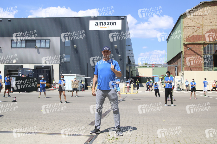 Axel Schulz mit Amazon-Läufern. Zahlreiche Mitarbeiter aus vier Amazon Verteilzentren in Berlin/Brandenburg laufen eine Woche lang gemeinsam für den guten Zweck. Für jeden gelaufenen Kilometer spendet Amazon einen Euro an die Arche, um damit die nachhaltige Arbeit zugunsten benachteiligter Kinder und Jugendlicher zu fördern. Bei der Charity-Aktion wird diesmal mit einer Spendensumme in Höhe von insgesamt 18.000 Euro gerechnet. Vor dem finalen Lauf am Borsigturm in Berlin-Tegel gibt Boxlegende Axel Schulz den Läufern und Läuferinnen Tipps aus seiner Erfahrung als Sportler und nimmt von Amazon-Standortleiter Tim Stapf den Spendenscheck für die Arche entgegennehmen. Berlin, 11.06.2021