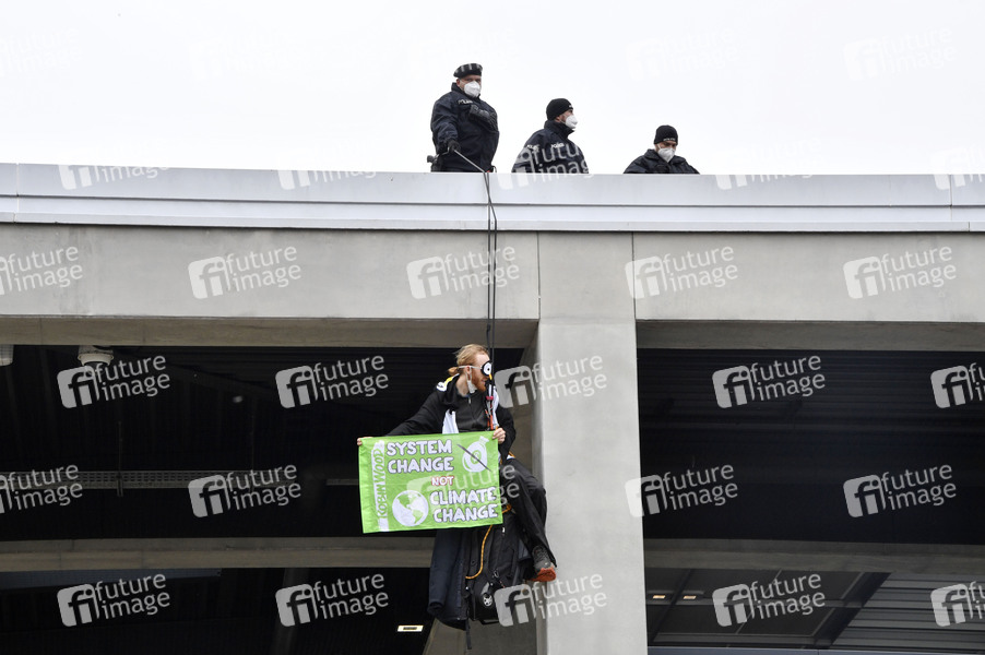 Klimaaktivisten der Aktionsgruppe 'Am Boden bleiben' protestieren gegen die Eröffnung des Flughafens Berlin-Brandenburg (BER). Schönefeld, 31.10.2020