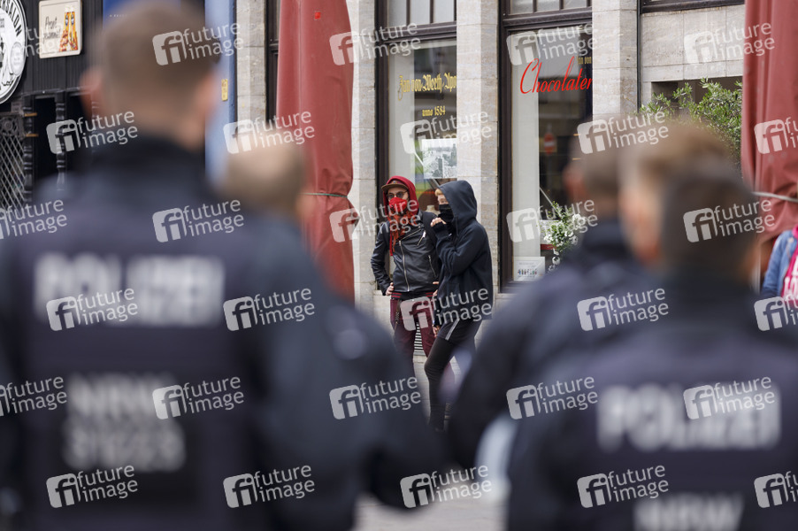 Demo, Demonstranten, Demonstration, Demonstrationszug, Erster Mai, Feiertag, Maidemo, Mai-Demo, Politik, Protestmarsch, Protestplakat, Protestzug, Tag der Arbeit, Polizei, Polizeieinsatz, Polizeibeamte, Polizeipräsenz, Polizist, Polizisten, Polizistin, Sicherheitskräfte, Corona, Sars-CoV-2, Covid-19, Coronavirus, Coronaviren, Corona-Virus, Coronakrise, Corona-Krise, Corona-Pandemie, Coronamaßnahmen, Corona-Schutz, flatten the curve, Ausnahmesituation, Kontaktverbot, Versammlungsverbot, Mindestabstand, Social Distancing, Kontakt verboten, Ausgangsbeschränkung, Abstand, Abstandhalten, Abstandsregel, Abstandsregeln, Allgemeinverfügung
