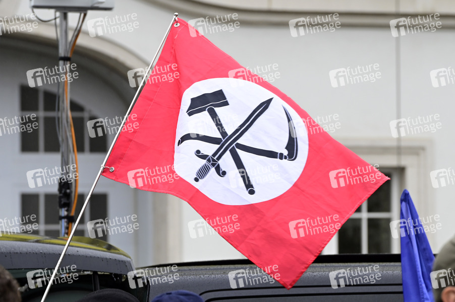 Eine Flagge der Gruppe Sozialrevolutionärer Nationalisten (GSRN) bei einer 'Friedensprozession' am Karfreitag unter dem Motto 'Frieden kennt keine Brandmauern' auf dem Postplatz. Dresden, 18.04.2025