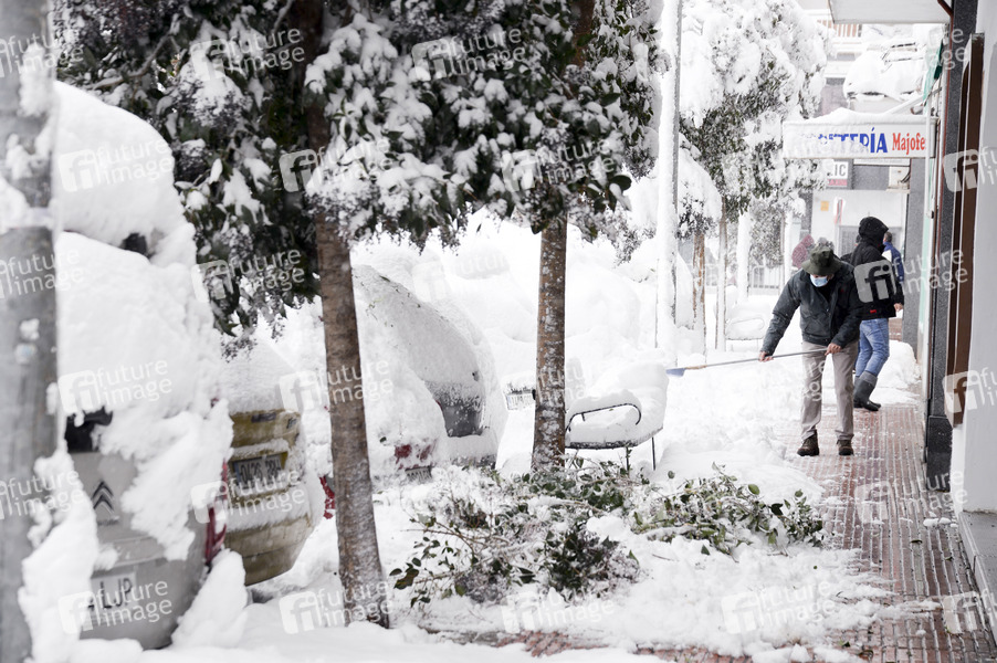 Schnee schippen - Das Sturmtief Filomena sorgt in der Region Madrid und anderen Teilen Spaniens mit starken Schneefällen für Chaos. Die Hauptstadt Madrid wurde durch historisch heftigen Schneefall lahmgelegt. Seit 50 Jahren hat es nicht so geschneit. Der Verkehr ist in weiten Teilen des Landes zusammengebrochen. Alcalá de Henares, 09.01.2021