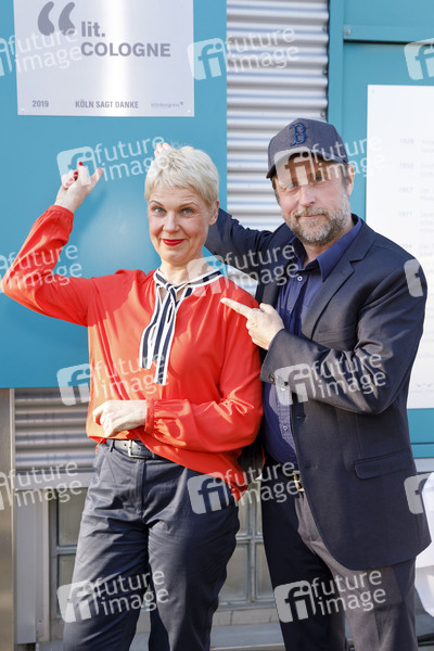 Cordula Stratmann und Bjarne Mädel bei der Enthüllung der Ehrentafel für die lit.cologne im Kölner Tanzbrunnen für über 10 Jahre Lesungen der lit.cologne im Theater am Tanzbrunnen. Köln, 29.03.2019