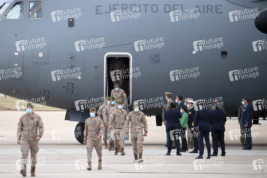 Soldaten, Rückkehr, Krieg, Einsatz, Streikräfte, Operation Enduring Freedom, ISAF, ASPFOR, Afghanistan Spanish Force, Adel, König von Spanien, Staatsoberhaupt, Fürst von Asturien, Fürst von Girona, Felipe de Borbón, Monarch, Royal, Politiker, Ministerpräsident von Spanien, Parteivorsitzender der Partido Socialista Obrero Espanol, Politikerin, Verteidigungsministerin