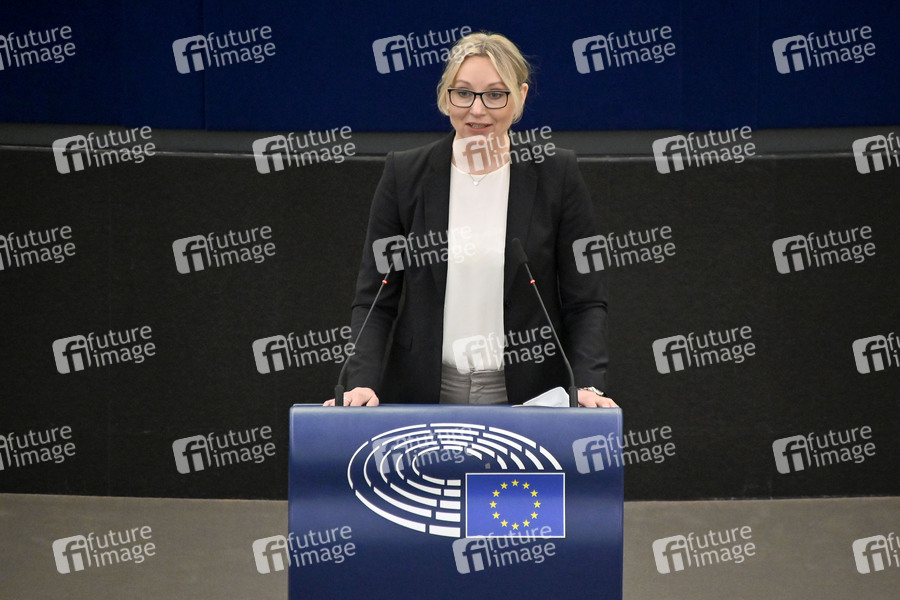 Jessica Stegrud bei einer Plenartagung zum sechsten Bewertungsbericht des Weltklimarats der Vereinten Nationen zum Klimawandel im Plenarsaal des Europäischen Parlaments. Straßburg, 04.04.2022