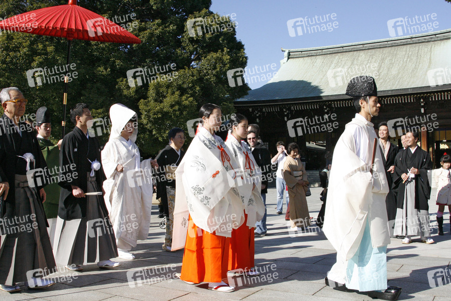Meiji-jingu, Shinto-Schrein, Shinto-Priester, Braut, Bräutigam, Brautpaar, Hochzeit