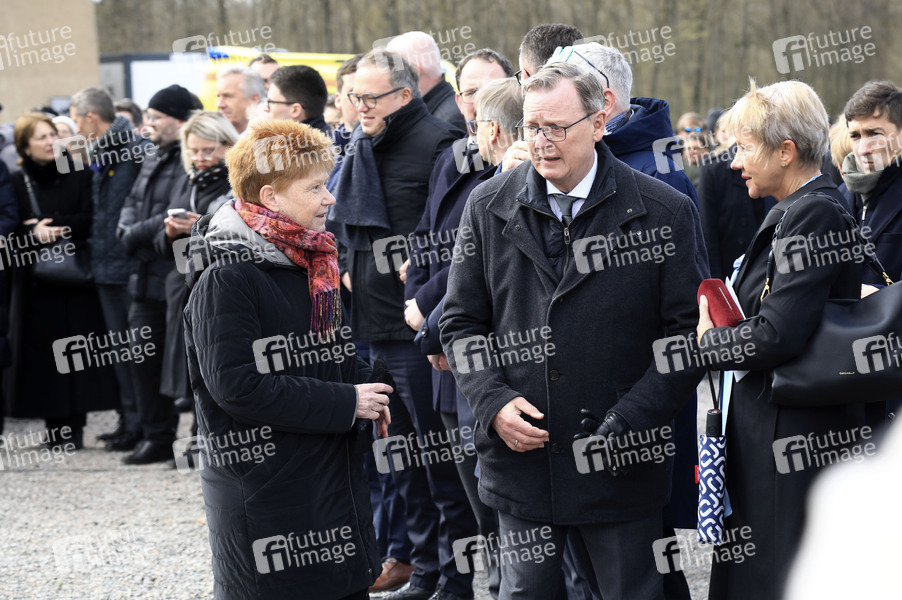 Petra Pau und Bodo Ramelow bei der Kranzniederlegung zum 80. Jahrestag der Befreiung des Konzentrationslagers Buchenwald und Mittelbau-Dora. Weimar, 06.04.2025