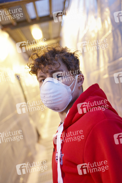 Ein Passant posiert mit Atemschutzmaske am Eingang der KVB-Haltestelle Rathaus. Köln, 19.03.2020