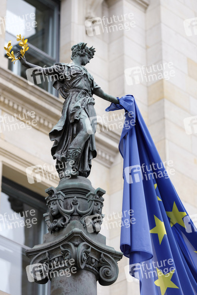 Eine Europa-Flagge, mit ihrem Kranz aus zwölf goldenen fünfzackigen Sternen, hat sich in einer Statue am Reichstag verfangen. (Themenbild, Symbolbild) Berlin, 01.04.2021