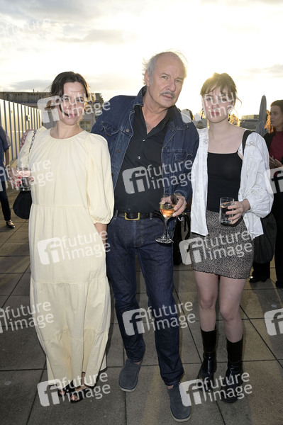 Annika Kuhl, Leander Haußmann und Kunigunde Kuhl beim Eröffnungsempfang der UFA Filmnächte 2024 auf der Dachterrasse der Bertelsmann Repräsentanz. Berlin, 21.08.2024