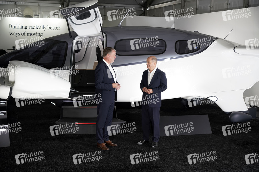Olaf Scholz vor einem Lilium Jet beim Eröffnungsrundgang der ILA Berlin auf dem ILA-Gelände am Flughafen BER Berlin-Brandenburg. Berlin, 05.06.2024