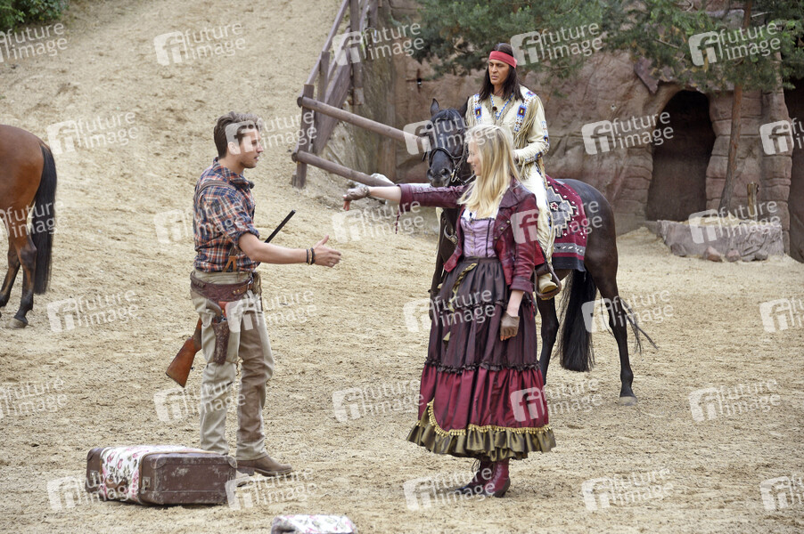Raul Richter, Larissa Marolt und Alexander Klaws beim Pressetermin der Karl-May-Spiele 2019 mit Szenen aus 'Unter Geiern - Der Sohn des Bärenjägers' im Freilichttheater am Kalkberg. Bad Segeberg, 21.06.2019