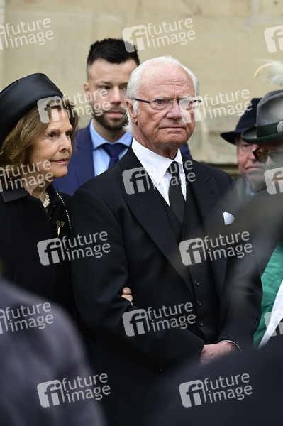 Königin Silvia von Schweden und König Carl Gustaf von Schweden bei der Trauerfeier für Andreas Prinz von Sachsen-Coburg und Gotha auf dem Schlossplatz von Schloss Ehrenburg. Coburg, 24.04.2025